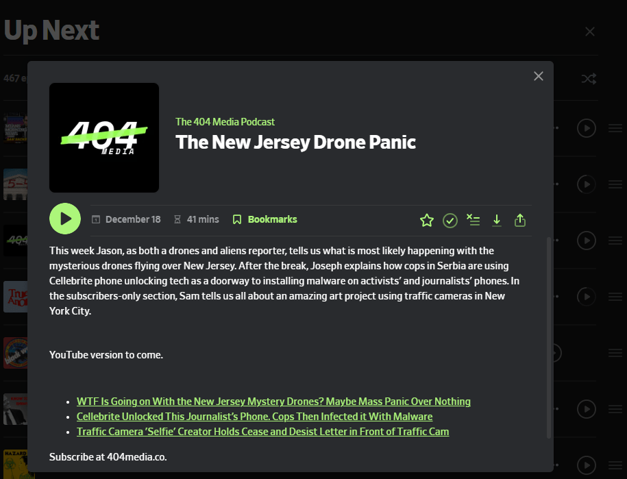Feature Request: On Mac/PC/Web interface can you add an option to Archive from the Up Next screen, similar to the way New Release and In Progress screens work? Or at least on the popup once you click the individual episode (same row as star, mark as played, remove from up next, etc). It would be useful to save a few clicks of having to go to the podcast feed.