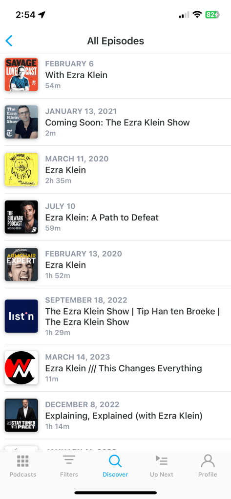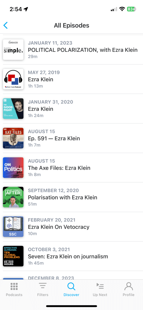 Please add functionality to sort and filter podcast episodes by TIME, when using the discover feature. As of right now, if I search for any keywords, it shows me all the episodes in no order, with no ability to hone the results. Let’s say I wanted to find all episodes (from any/all podcasts) that feature the writer Ezra Klein in the last month. When I search his name in Discover, the attached screen shots are what I get. No chronological order, no ability to sort, no ability to filter.