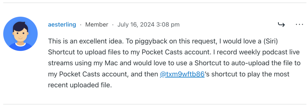 I use an app to record several live radio shows/podcasts on my computer each day. The only step of the process I have to do manually is upload the recorded MP3s to Pocket Casts. I would love a way to automate this as well, so the recordings automatically show up in Pocket Casts when they’re ready.
