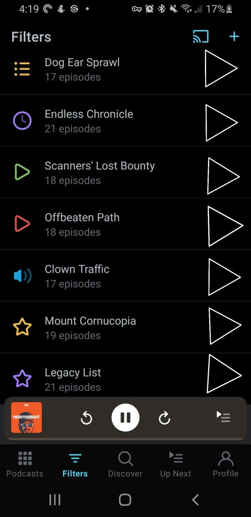 A simple and useful addition would be play buttons next to filters (as seen above) that play either from last play location or beginning of filter. This would allow for more streamlined podcast selection and a better UI experience.