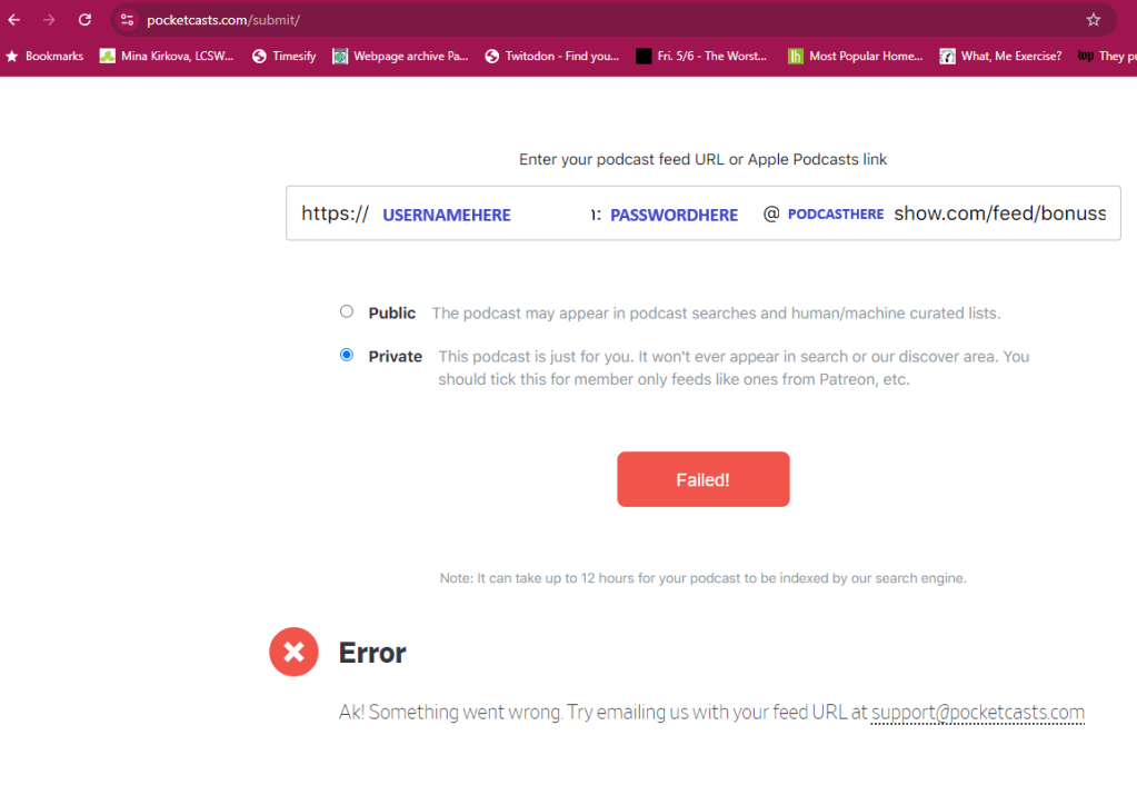 I am trying to submit a custom feed for a paid podcast. I followed the instructions on the Password Protected Podcast feeds Pocketcast support page.