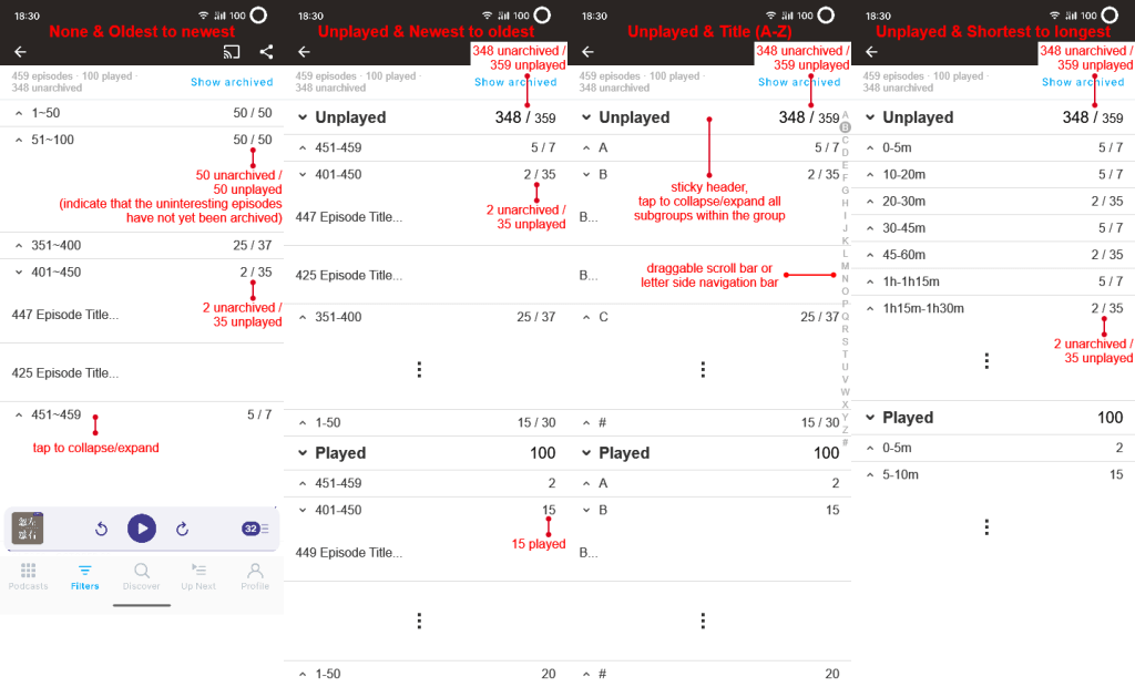 Sometimes, I need to find a played episode from a podcast, and it is intuitive to go to the podcast page and look for it in the Played group (I recently learned by chance that Listening History could search for the podcast name to filter its episodes, but I cleared my listening history once…) But often, there are hundreds of played episodes and are auto-archived by default (which I prefer to remain), so filters won’t work. Instead,- tapping group labels to collapse/expand or reverse the order, e.g., Played – Unplayed;